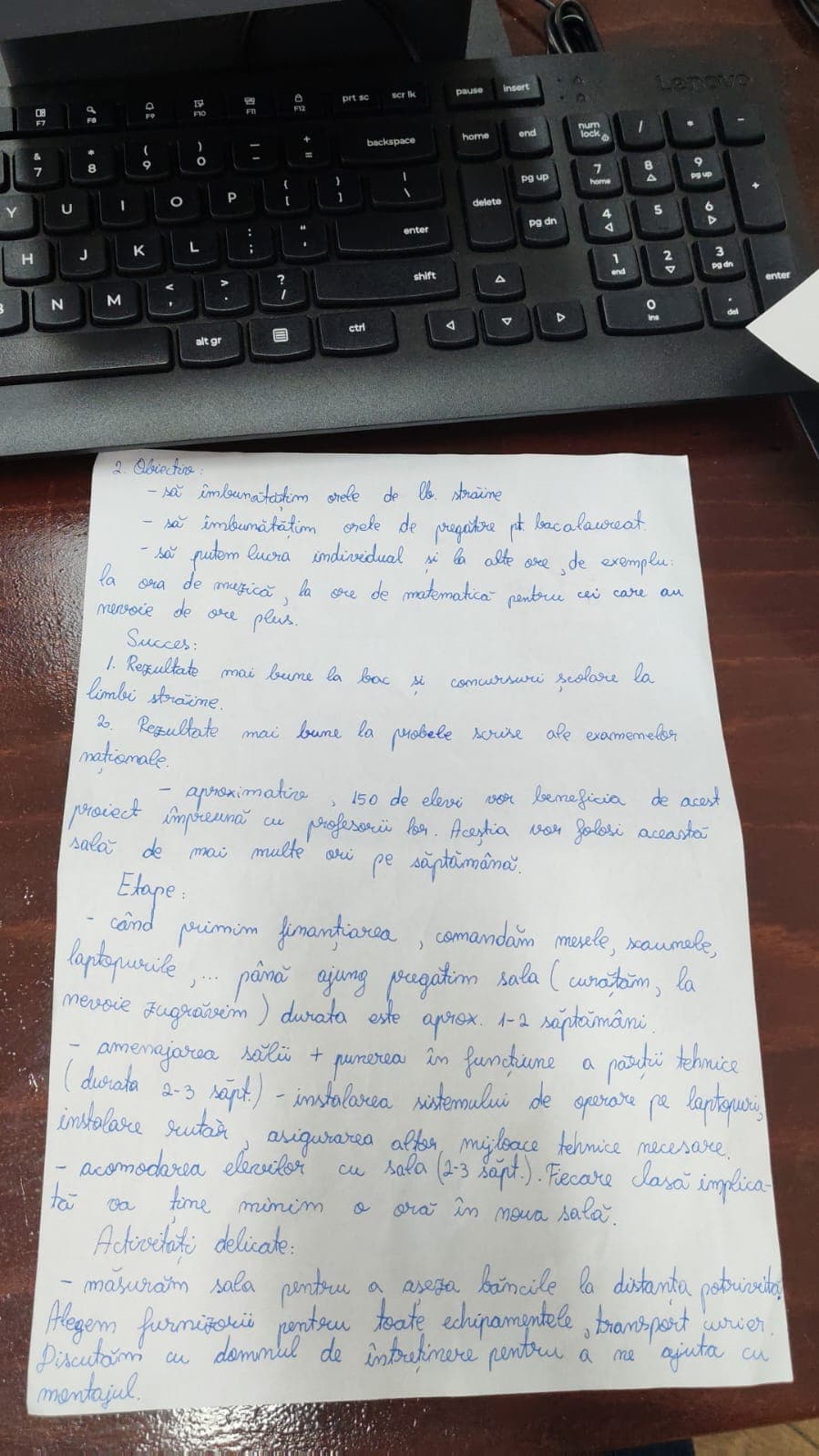 Doresc să particip în următorul mod la acest proiect: îl voi ajuta, împreună cu echipa mea, pe domnul de întreținere să aducă obiectele pe care le am comandat de la curier din curte în sală, numim împreună un resposabil de sală care are grijă de sală, de integritatea obiectelor. Pe lângă aceste aspecte vom face cunoscut faptul că avem o astfel de sală astfel încât să atragem cât mai mulți elevi doritori de performanță în școala noastră.