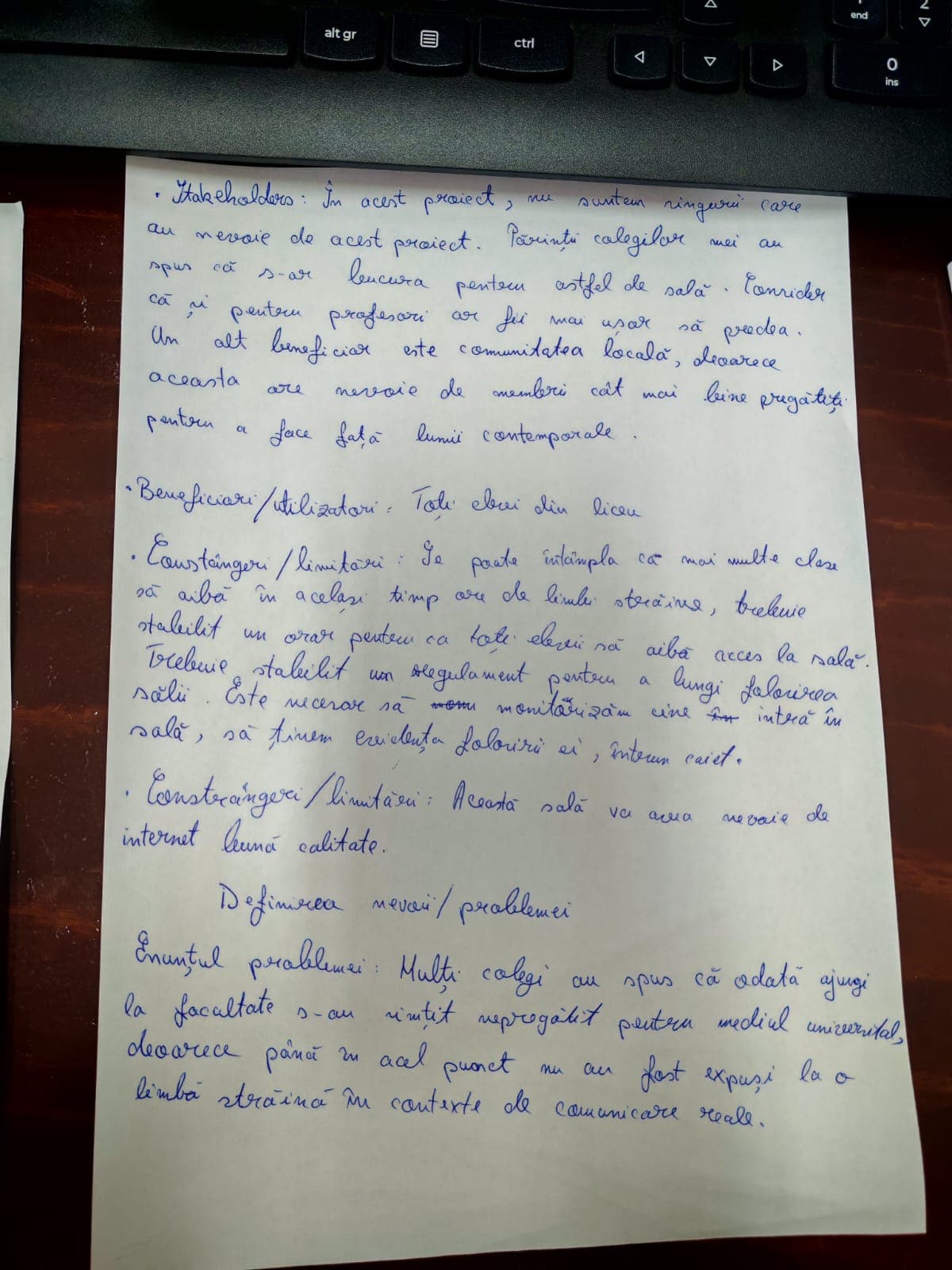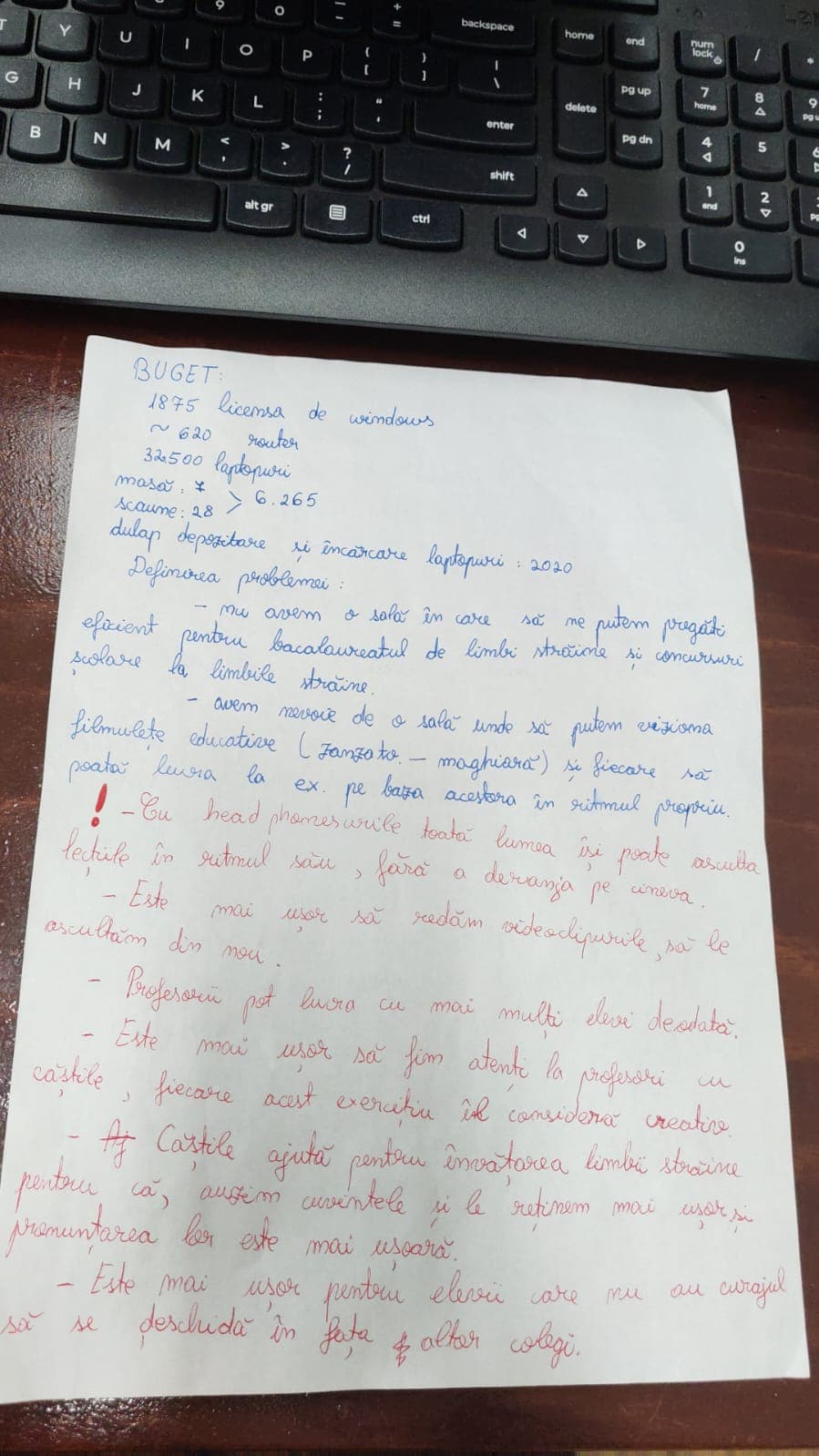 Mai mulți elevi și-au exprimat dorința de a avea o experiență similară la ora de limbi străine cu cea a unei vizite într-o țară străină. Ei își doresc să învețe în contexte de comunicare reale, îmbogățindu-și vocabularul utilizând exerciții inspirate din situații de comunicare cotidiene/reale. Ceea ce privește exercițiile de gramatică, generația noastră dorește feedback imediat, elevii doresc să lucreze și să se dezvolte singuri, nu mai vor să depindă de profesor pentru a-l corecta în lucruri mărunte, care pot fi corectate și de inteligența artificială. Acest proiect este important, deoarece elevii ar avea rezultate mai bune la bacalaureat şi concursuri şcolare la limbi străine. Elevii ar putea învăţa limba străină în ritm propriu, profesorii le-ar putea da exerciţii potrivite nivelului lor. Elevii ar putea să-şi dezvolte toate cele 4 competenţe care se cer la bacalaureat. În cazul exerciţiilor de ascultare, elevii nu ar fi deranjaţi de zgomotul din jur datorită căştilor. Părerea noastră este că, e important să avem o sală a noastră unde putem să facem ore în plus pentru limbile străine (engleza, română-mai ales cei care doresc performanță). În sala respectivă avem nevoie de căști auditive pentru că este mai ușor să redăm videoclipurile, să le ascultăm din nou. Profesorii pot lucra cu mai mulți elevi deodată.
