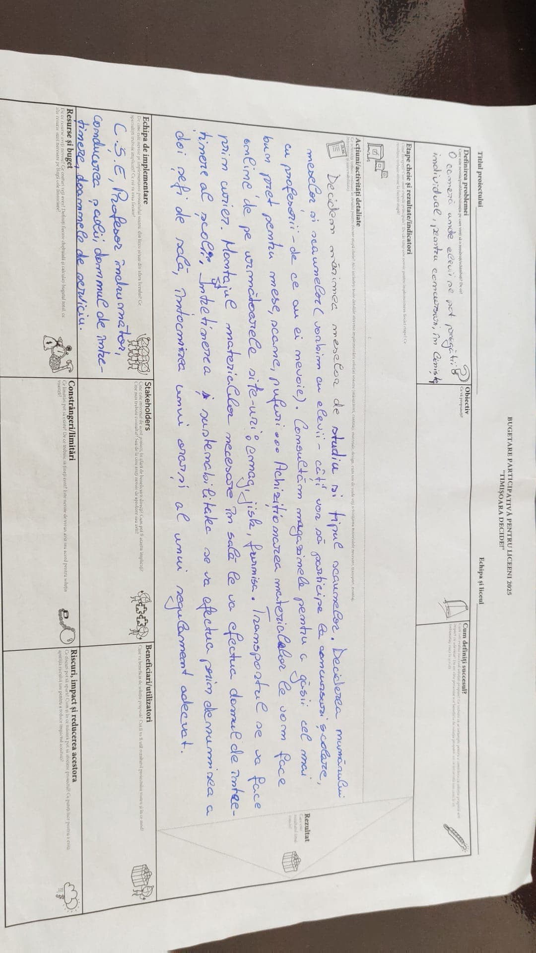 Doresc să particip în următorul mod la acest proiect: voi ajuta la montarea mobilierului și la întreținerea sălii. Pe lângă aceste aspecte voi organiza împreună cu colgii mei activități care să servească comunitatea școlii, care să faciliteze accesul elevilor la pregătiri pentru concursuri, olimpiade, examene naționale și să ajute la întărirea relațiilor de colaborare între elevi și porfesori, facilitând mentoratul.