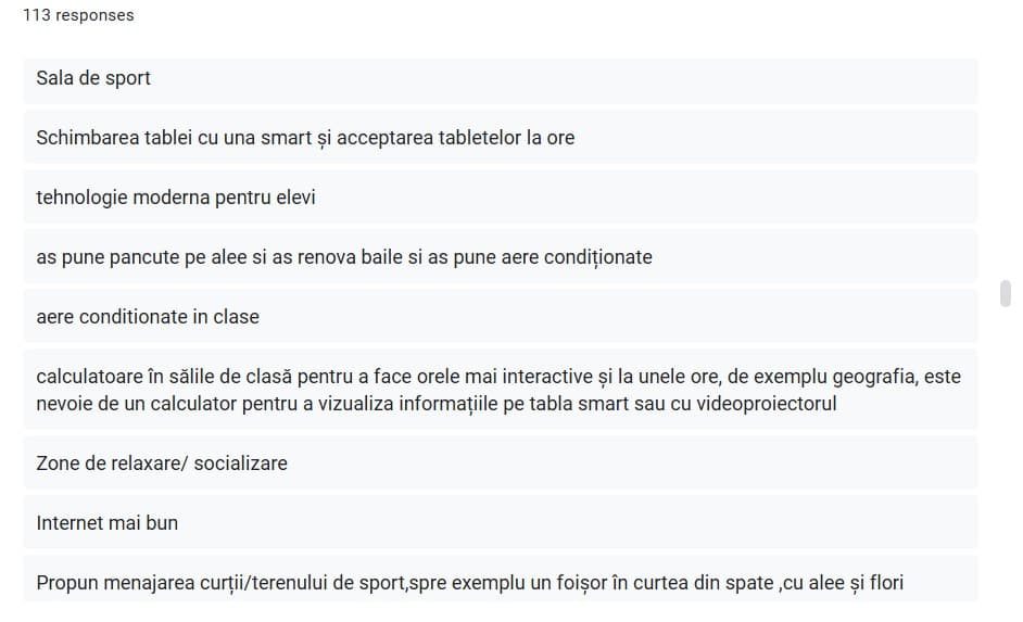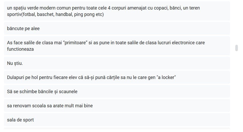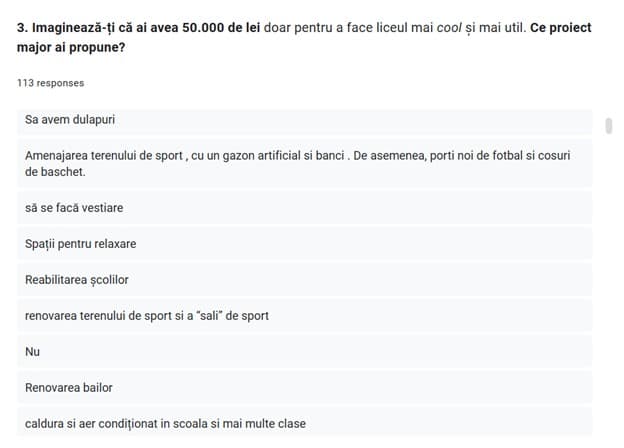 Intre 7-10 octombrie a avut loc colectarea ideiilor elevilor prin intermediul unui formular trimis la nivelul scolii. Elevii si-au exprimat dorintele in legatura cu nevoile lor din scoala. In urma acestui proces de colectare , echipa proiectului a selectat 4 proiecte cu cele mai multe voturi. Propunerile sunt sustinute de elevii liceului.