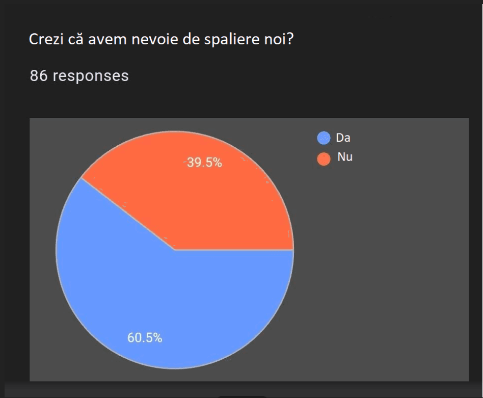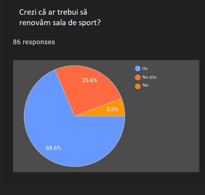 Elevii școlii au fost implicați în validarea nevoilor identificate prin completarea unei chestionar "Google forms". După prelucrarea datelor chestionarului, am aflat că dintre cei 86 de elevi repondenți 68.6% susțin ideea noastră de a dota sala de sport, 5.8% sunt împotriva ideii, iar 25.6% s-au abținut de la vot. Am intervievat mai mulți dintre părinții elevilor de liceu și am aflat că susțin ideea noastră.