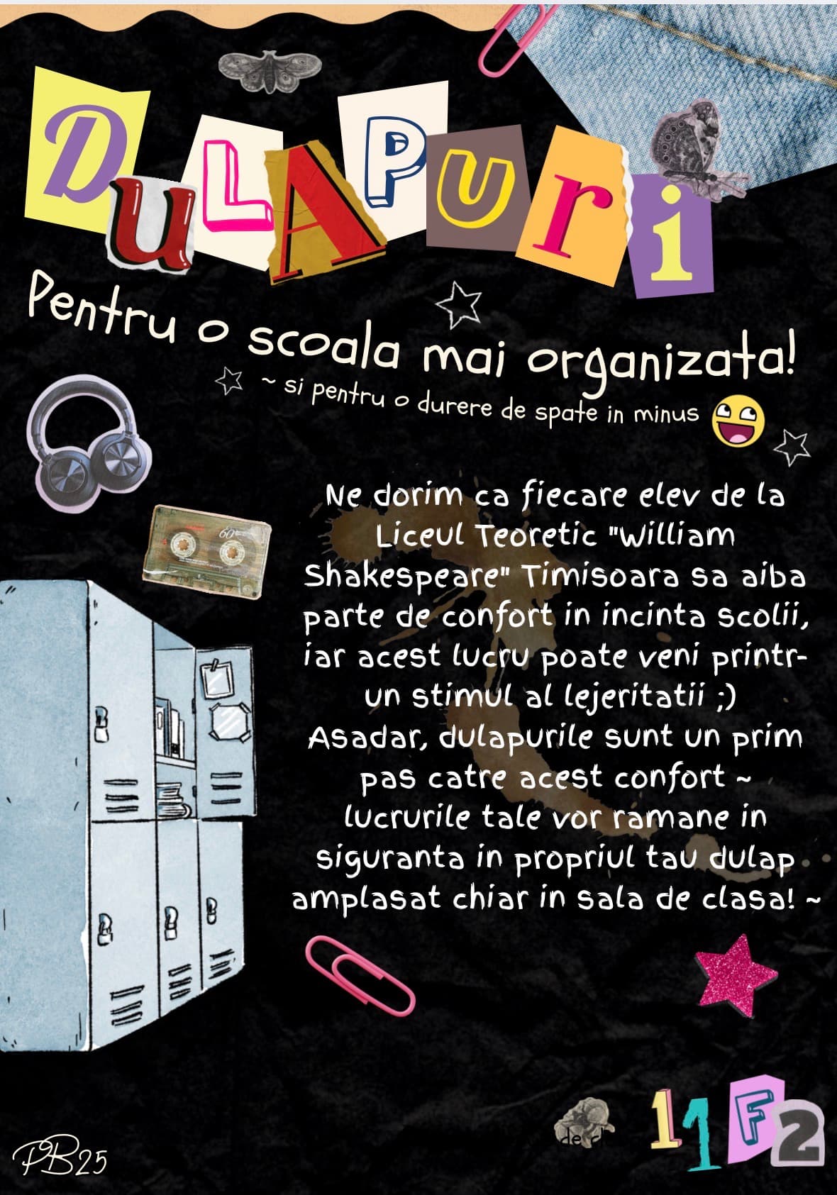Acest proiect aduce in fata elevilor oportunitatea de a usura drumul catre scoala si inapoi acasa. Asadar, dorim a prezenta ideea de dulapioare personale. In fiecare clasa, care permite spatiul necesar, vor fi asezate dulapuri a cate sase compartimente, cu rolul de depozitare si organizare a materialelor artistice, a manualelor scolare, dar si a echipamentului sportiv. Fiecare copil va beneficia de spatiul sau de depozitare, primind o eticheta cu numele sau pentru a recunoaste dulapiorul si o cheie cu care ulterior il va incuia, pentru ca obiectele personale sa fie protejate. Dulapurile, fiind confectionate predominant din lemn, reduc procentul de poluare emis de orasul nostru. De asemenea, mobilierul acesta poate fi folosit cu usurinta si de urmatoarele generatii de elevi a liceului nostru, contribuind la o viata scolara mai blanda si organizata. Pentru ca aceasta idee sa fie implementata, necesar este bugetul de 35.000 de lei, in care se incadreaza achizitionarea dulapurilor si echipa care le va monta.