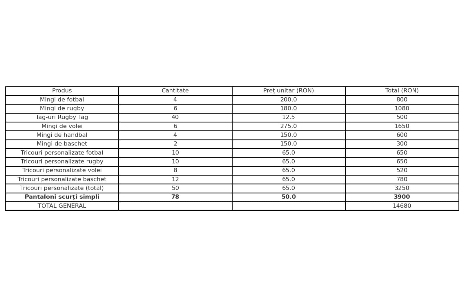 Mingi de fotbal-4 bucati-200RON X 4- total 800 RON Mingi de Rugby-6 bucati-180RON X 6-total 1080 RON Tag-uri Rugby Tag- 12,50RON X40-total 500 RON Mingi de volei- 275RON X 6- total 1650 RON Mingi de handbal- 150RON X4- total 600 RON Mingi de baschet-150RON X2-total 300 RON Tricouri personalizate pentru fotbal- 65RON X 10-650 RON Tricouri peronalizate pentru rugby- 65RON X 10- 650 RON Tricouri peronalizate pentru volei-65RON X 8-520 RON Tricouri peronalizate pentru baschet-65RON X12- 780 RON Tricouri personalizate in total-65RON X 50-3250 RON Pantaloni scurti simpli-50RON X 78- 3900 RON Total-14.680 RON